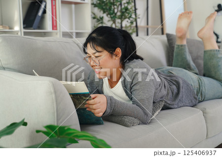 Asian young woman with glasses reading a book on the sofa in the living room happily
