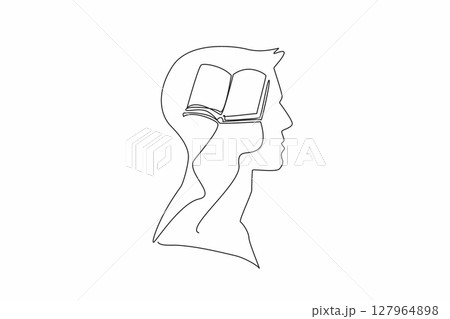 Continuous one line drawing the head of a man with an open book in the middle of his head. High knowledge. Like a walking book. Inside the Head of Man. Single line draw design vector illustration