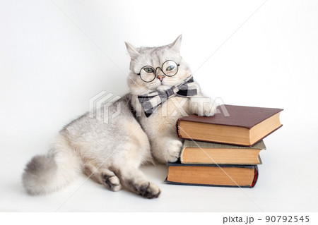 Serious white cat in a gray bow tie and glasses, lies on a stack of old books