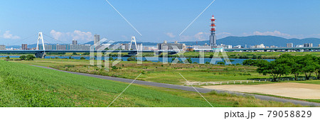 パノラマ 淀川右岸から豊里大橋、生駒山