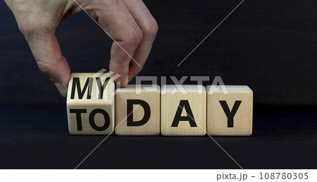 Today is my day symbol. Businessman turns the wooden cube and changes concept words Today to My day. Beautiful grey table grey background, copy space. Business, motivation today is my day concept.
