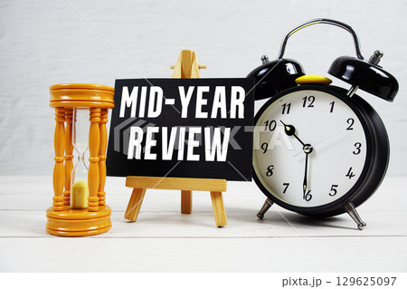Mid-Year Review text with hourglass and alarm clock on wooden background