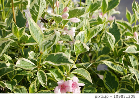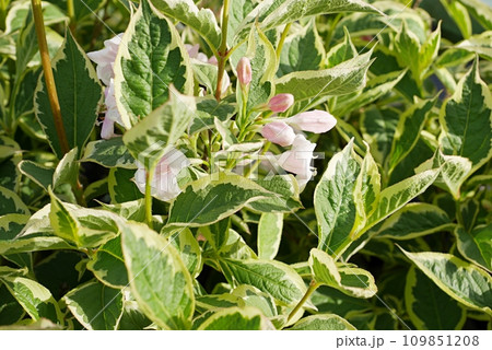 咲き始める斑入り大紅ウツギ。花言葉は「豊かで美しい」そして「移り気」。