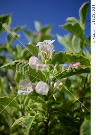 咲き始める斑入り大紅ウツギ。花言葉は「豊かで美しい」そして「移り気」。