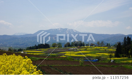 残雪の斑尾山、たなびく雲、とうとうと流れる千曲川を背景に咲き誇る菜の花