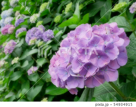 満開の紫陽花と咲き始めた薄紫と白の紫陽花