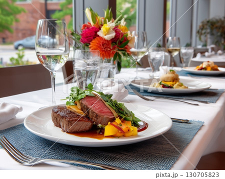 Exquisite Steak Fine Dining Juicy Cut with Gourmet Garnish in Elegant Restaurant