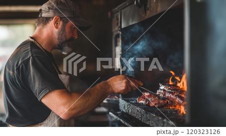 A chef skillfully grills barbecue ribs over an open flame, showcasing culinary expertise in an outdoor kitchen.