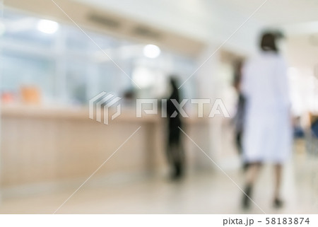 Medical blur background customer reception or patient service counter, office lobby in hospital clinic, or bank business building blurry interior inside waiting hall area