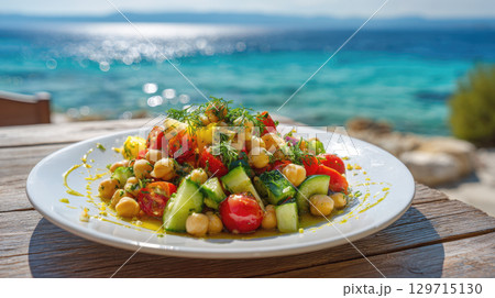 A vibrant, healthy chickpea salad with fresh cucumbers, tomatoes, and herbs is presented on a white plate on a wooden table, with the sparkling blue sea in the background