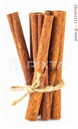 Bundle of Cinnamon Sticks Tied with Jute Rope on White Background Culinary Ingredient