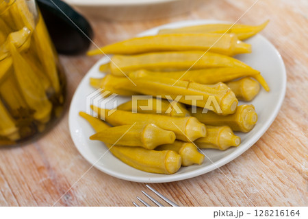 Pickled okra pods on plate, homemade preserves