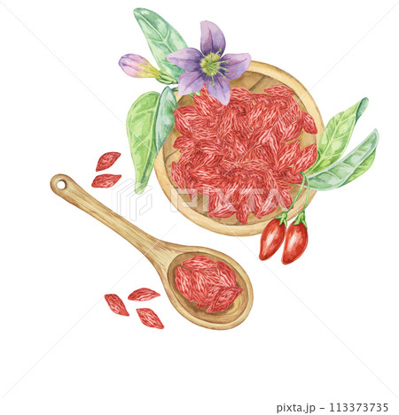 Wooden spoon and plate with dry and fresh goji berries. Hand-drawn watercolor clipart of superfood licium barbarum fruits. Design for printing, packaging, cards, food supplements isolated on white.