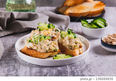 Delicious sandwiches with cod liver salad, egg and cucumber on a plate on the table