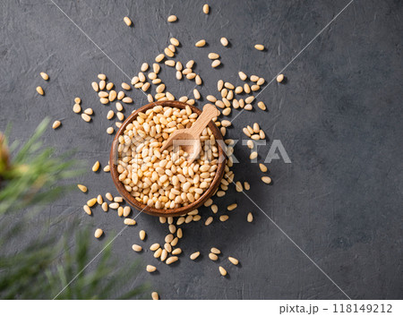 Pine nuts in a bowl and a scattered on a dark background with branches of pine needles.