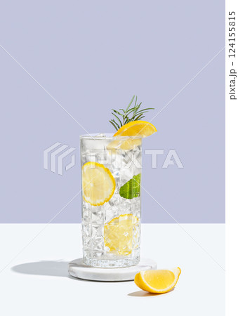Lemonade with lemon, rosemary and ice in a glass on a white blue background with shadow.