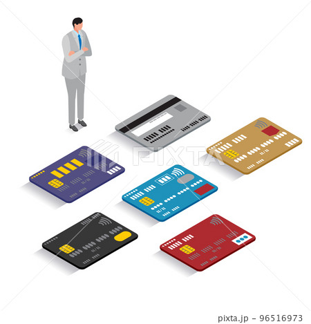 アイソメトリック_たくさんのクレジットカードを前に悩む男性