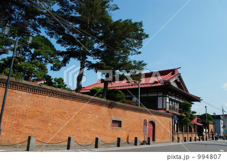 長いレンガ塀を見る太宰治記念館「斜陽館」風景