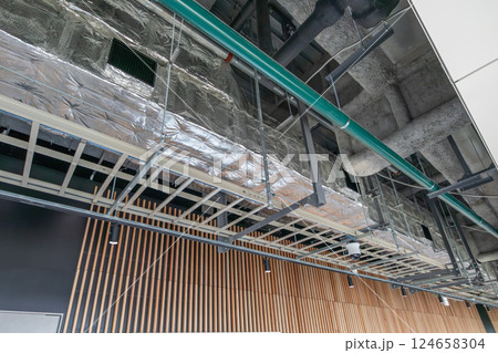 Ventilation system with pipes in silver insulation material in suspended ceiling during renovation.