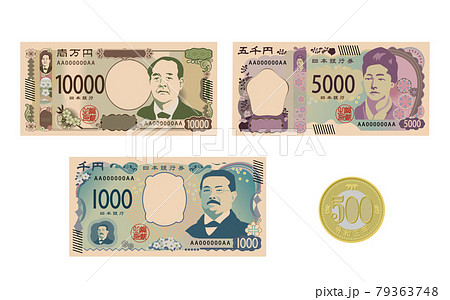 日本の新紙幣のイメージイラスト(10000円札、5000円札、1000円札)