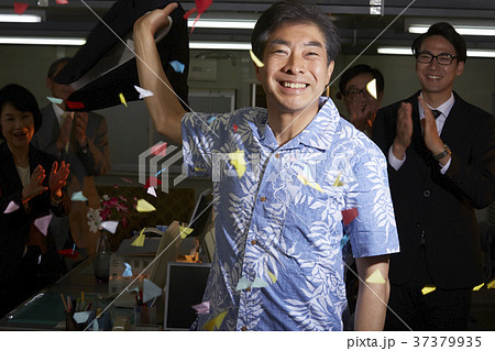 退職記念の花束を持つ日本人エグゼクティブ