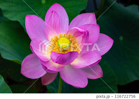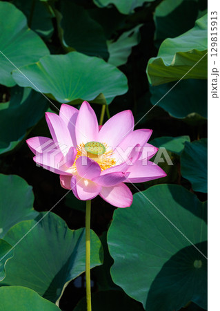夏の早朝の池に美しく咲くピンク色のハスの花