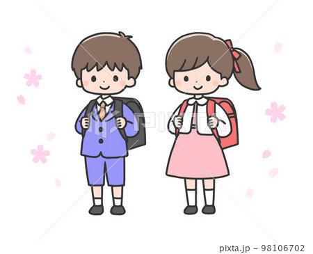 ランドセルを背負って嬉しそうな小学生低学年男女 イラスト