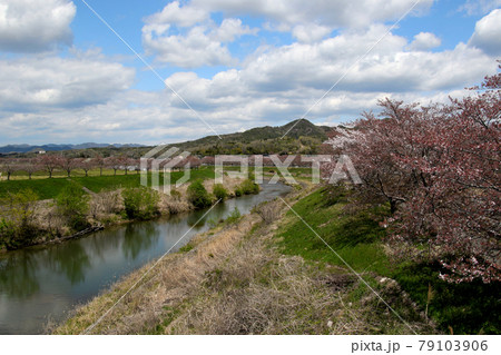 三田市えるむ橋から武庫川とさくら回廊を望む 背景は金毘羅山 さらに別アングル