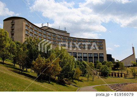 三田市けやき台 平谷川沿い散策路に現れた平谷池に面するホテル 木々を全面左に配置 別アングル
