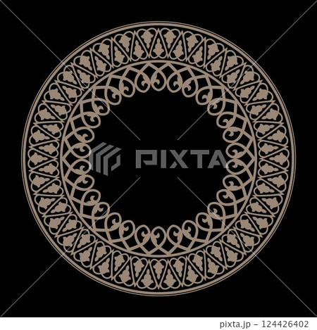 Ornamental gold round frame in byzantine style. Elegant element for design in byzantine style. Floral gold round border. Lace illustration for invitation, porcelain, textile, embroidery, sandblasting