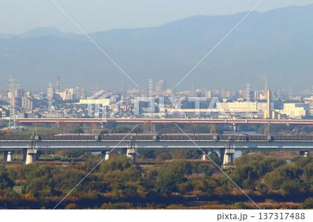 行き来するE6系とE5系新幹線と沿線の街並み