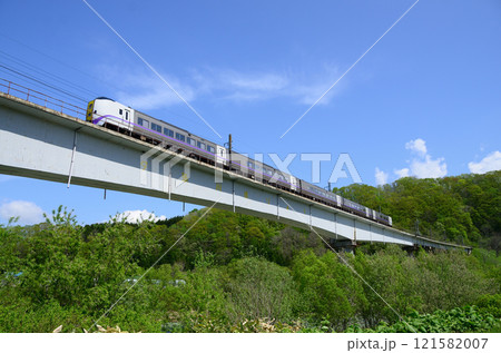 新緑と青空が眩しい石勝線の高架橋を快走する特急「おおぞら」