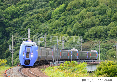 緑に囲まれた石勝線の山間カーブを行く特急「スーパーおおぞら」