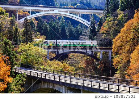 只見線 秋のアーチ三兄弟を渡る列車(福島県三島町、10月下旬午前)