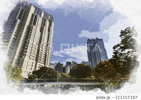 水彩画風 西新宿 東京都庁第二本庁舎とパークハイアット東京 東京都新宿区