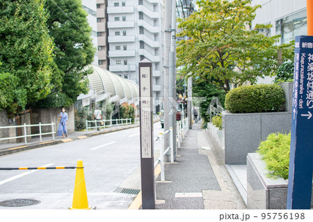 日本の東京都市景観 情緒漂う街。東京メトロ東西線 神楽坂駅 出入口2などを望む