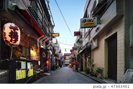 新宿の黄金の商店街ゴールデン街に集中する輝くネオンサインや提灯を翳すレトロなバーやレストランの路地。