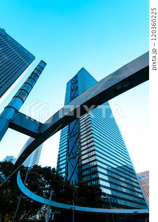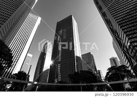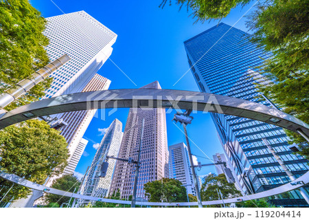「東京都」青空と高層ビルを見上げる新宿の風景