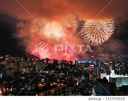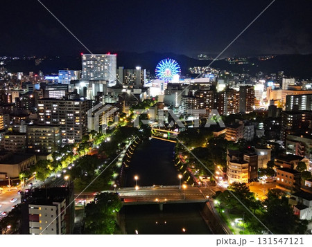 甲突川上空から花火大会終了後の街並みの夜景空撮