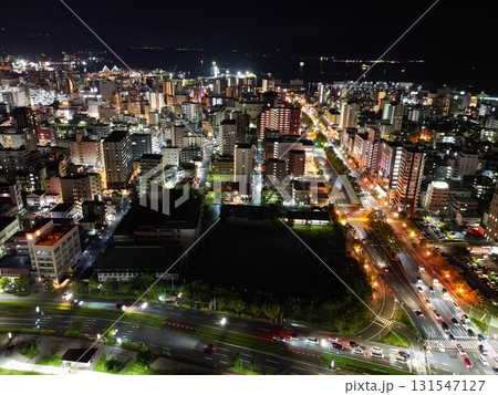 甲突川沿いから鹿児島市のパース通り沿いの夜景の空撮