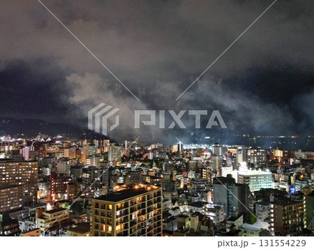 噴煙だけ残して花火大会終了後の鹿児島市街地の空撮