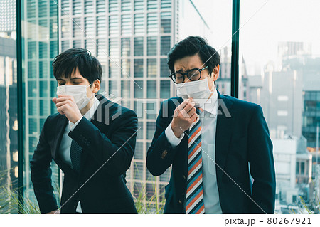 マスク姿で咳込む若手ビジネスマン2人
