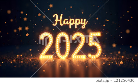 Happy New Years 2025 text banner with gold glitter and bokeh .