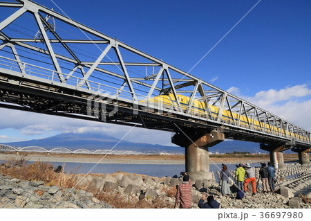 富士山をバックに富士川橋梁を通過するドクターイエロー