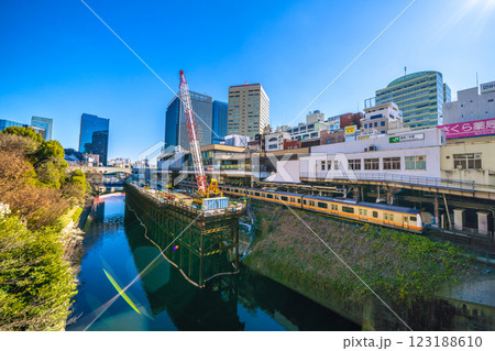 日本の東京都市景観 万世橋からマーチエキュートや太陽光などを望む(右奥は御茶ノ水駅方向)