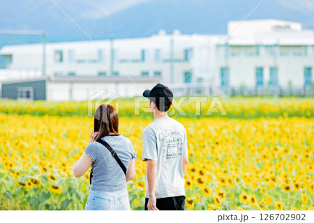 <安曇野>新村ひまわり畑を楽しむカップル