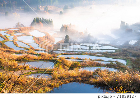 新潟県長岡市山古志 朝焼けに染まる霧と養鯉池の水面