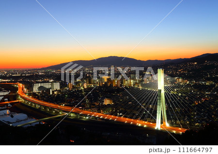 池田市五月山の秀望台からみた夕景、阪神高速道路池田線と新稲川大橋(ビッグハープ)