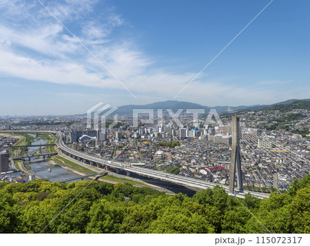 猪名川に架かる新猪名川大橋と五月山の風景