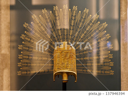 ツタンカーメンの金製扇子柄と羽根モチーフの展示